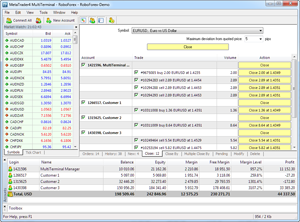 MetaTrader 4 MultiTerminal – is a tool that can help you to manage your trading operations from Members Area more efficiently. MT4 MultiTerminal makes trader’s work much easier because it provides an opportunity to trade on several trading accounts of the same type.
