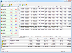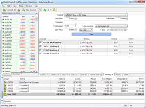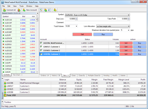 RoboForex MT4 MultiTerminal allows you to work with a lot of accounts on the same trading server. By pressing the button, you can send the order to several accounts at the same time, and MetaTrader 4 MultiTerminal will automatically distribute the volume of the orders based on the current profit, balance and available funds on each account.