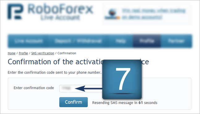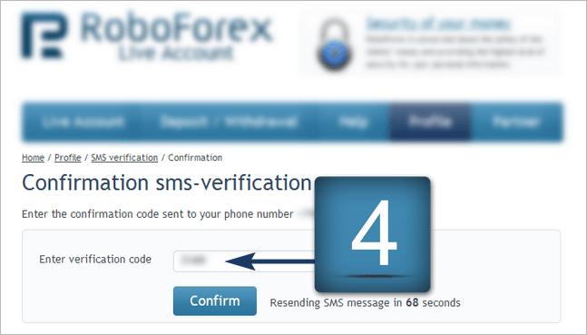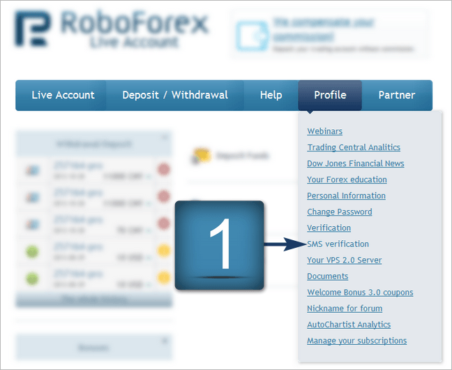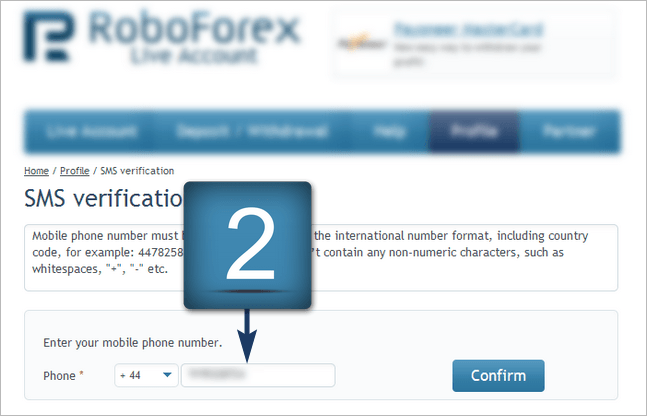 Login to your RoboForex Members Area and choose "SMS Verification" from "Profile" section.