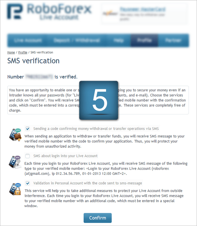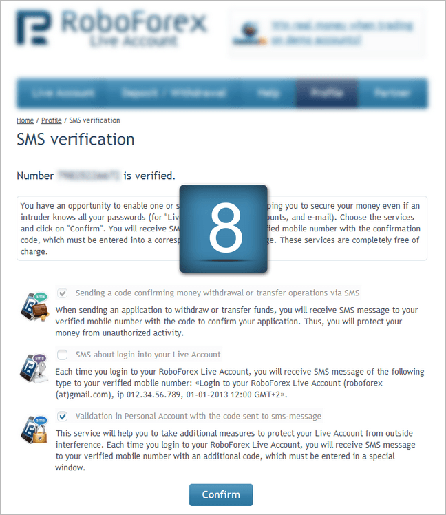 After passing SMS verification, you can enable one or several SMS services. Tick the services, which are interested to you, and click on "Confirm".