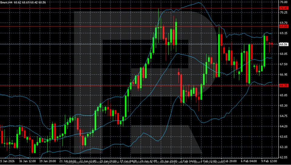 On the H4 chart, after a sharp momentum rally in late January, Brent prices reached the 70.00–70.50 area, where a local high formed and a correction began. The decline was accompanied by a move below the middle Bollinger Band and an increase in intraday volatility.