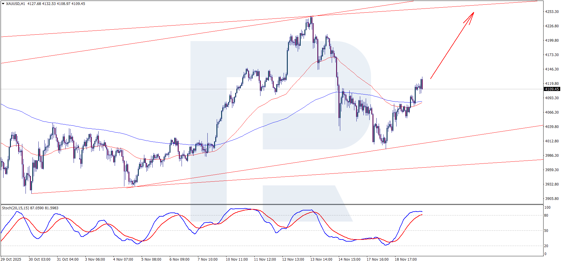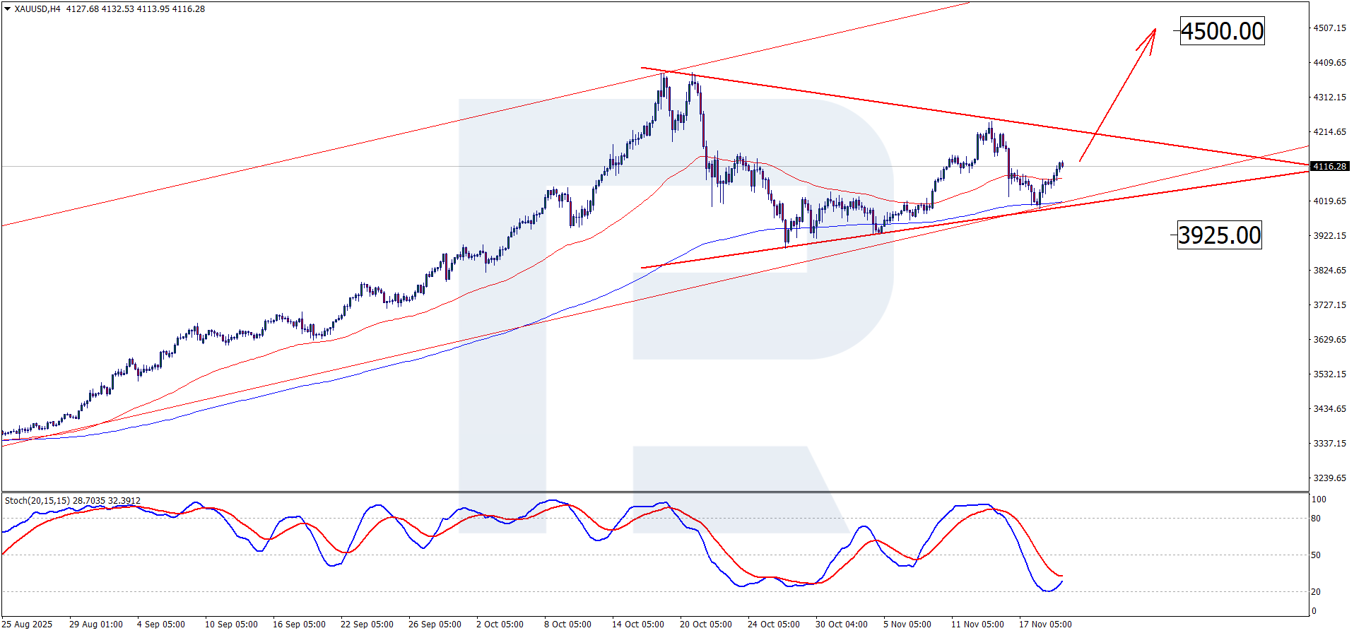 On the H4 XAUUSD chart, prices continue to move within a medium-term uptrend. The EMA-65 and EMA-200 lines are moving toward each other and may cross in the near future. In this case, it is highly likely that buyers will continue to accumulate positions and increase pressure on the USD. After the crossover, EMA-65 and EMA-200 may diverge again, confirming the continuation of the bullish trend. According to the main XAUUSD forecast for 2026, the bullish wave may continue toward 4,500 USD, after which a corrective wave is likely to form. A rebound from the support line on the Stochastic Oscillator increases the probability of further growth. Price consolidation above the 4,200 USD level will serve as a signal for continued upward movement.