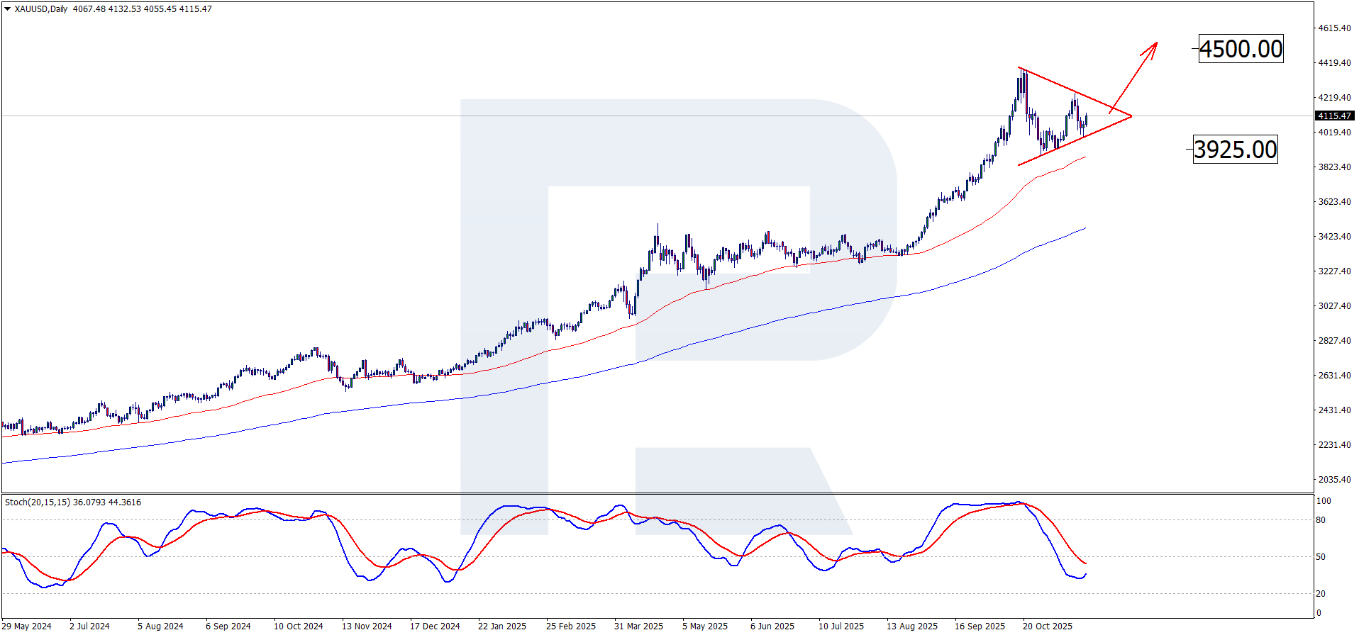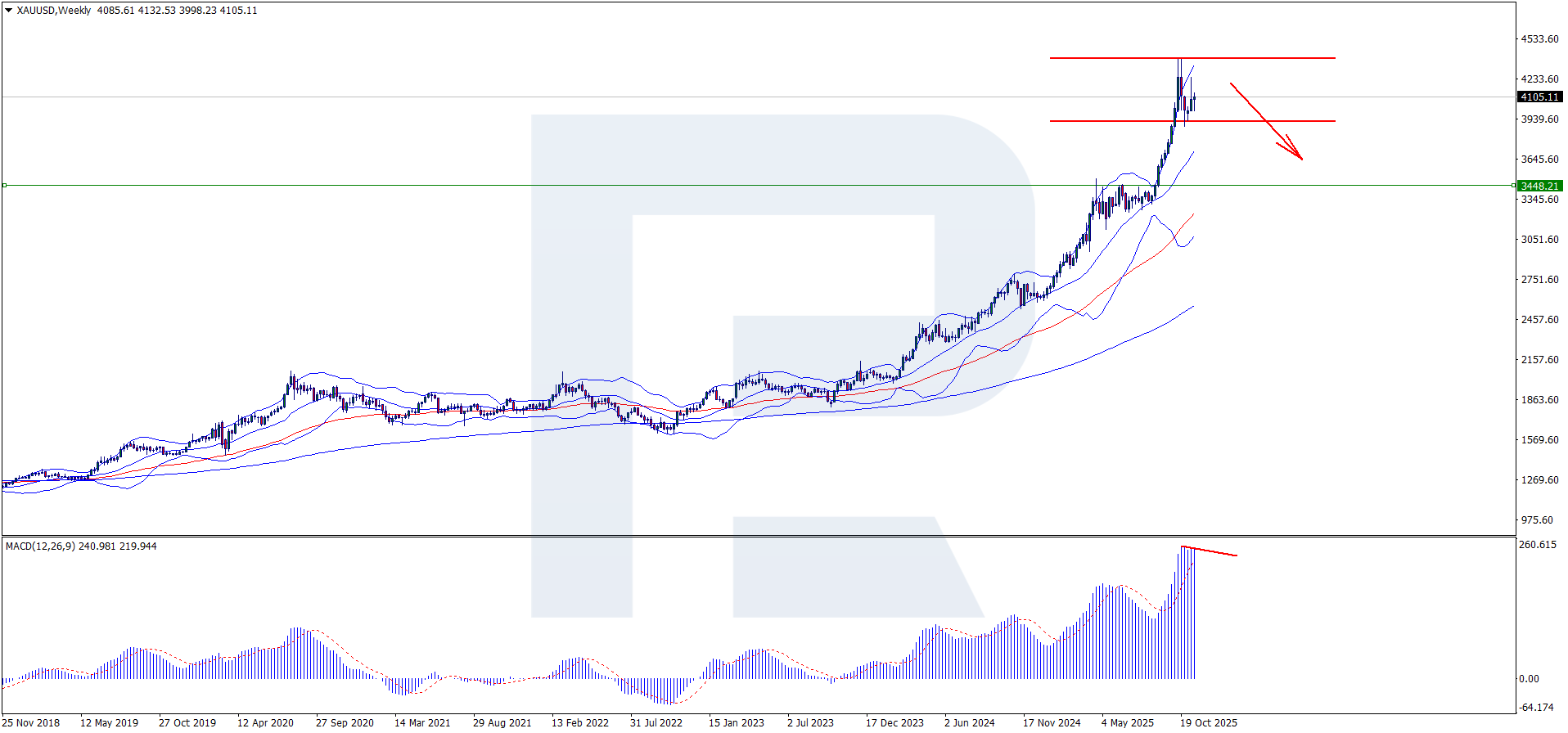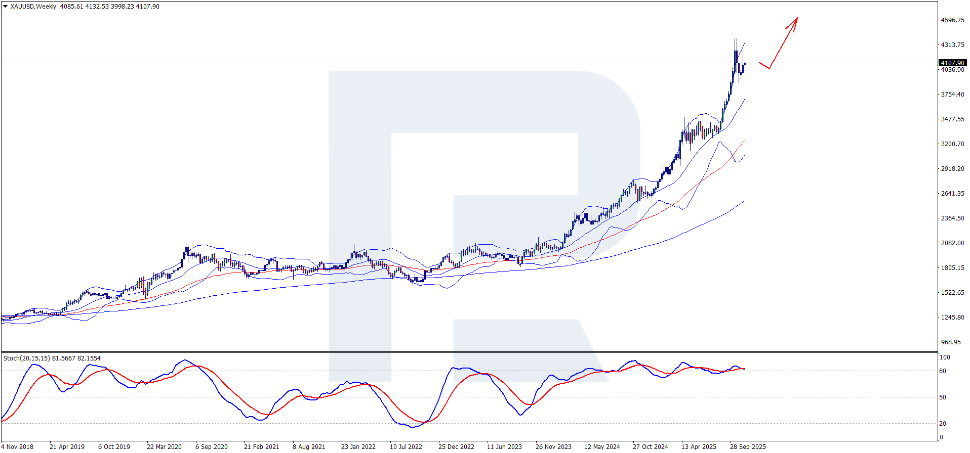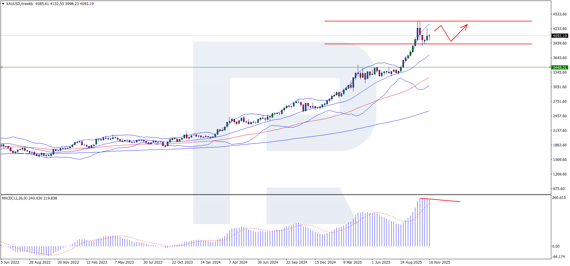 On the weekly timeframe, XAUUSD has been consistently holding above the middle line of the Bollinger Bands indicator since 2024, which indicates a prevailing bullish trend. At the moment, prices also remain above this line, regularly breaking through the upper band, which signals increasing buying pressure. Within the positive scenario and the XAUUSD price forecast, further growth of the precious metal can be expected, with a breakout of the psychological level of 4,500 USD. Consolidation above this mark will likely lead to another test of the upper Bollinger Bands boundary. Previously, an acceleration of growth occurred when the upper boundary of the indicator was breached; therefore, if the price consolidates above 4,500 USD, a continuation of the bullish trend can be expected, with the next target at 5,000 USD.