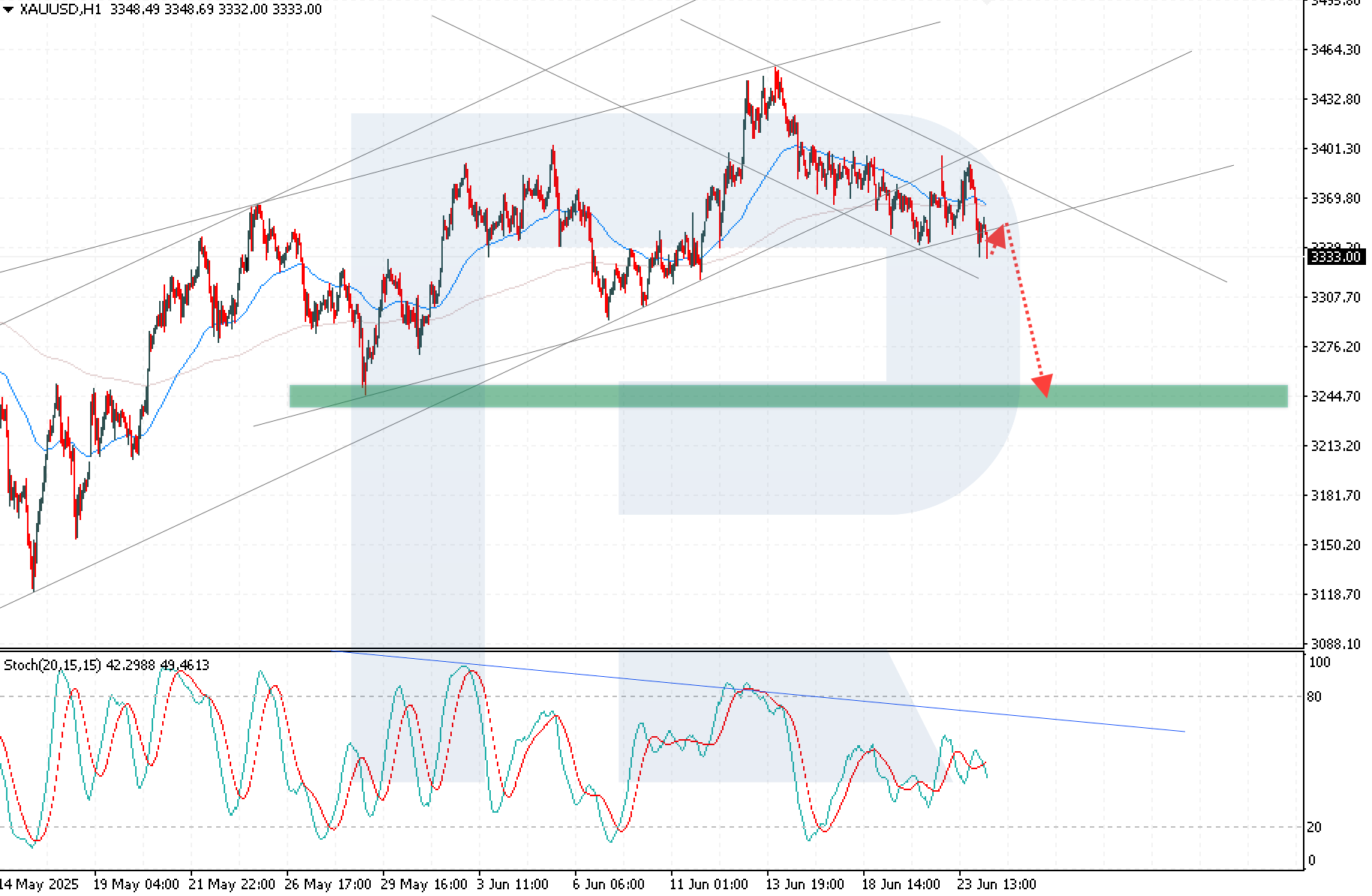 XAUUSD prices are plunging sharply amid easing geopolitical tensions and anticipation ahead of the Federal Reserve Chairman’s testimony. Current quotes stand at 3,331 USD. Discover more in our analysis for 24 June 2025.