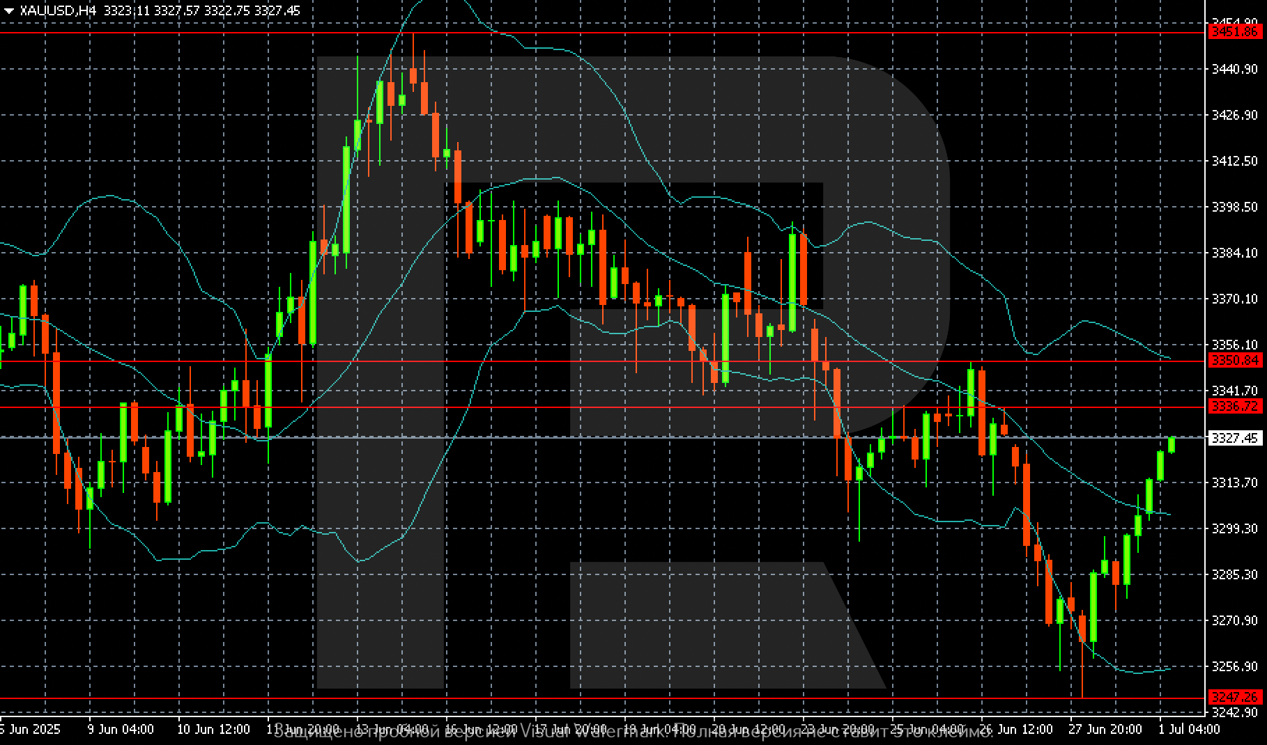 Gold (XAUUSD) is in a balance zone, rising in price for the second day and showing the possibility of further gains. The forecast for Gold (XAUUSD) for today, 1 July 2025, does not rule out growth to 3,336 and further to 3,350.