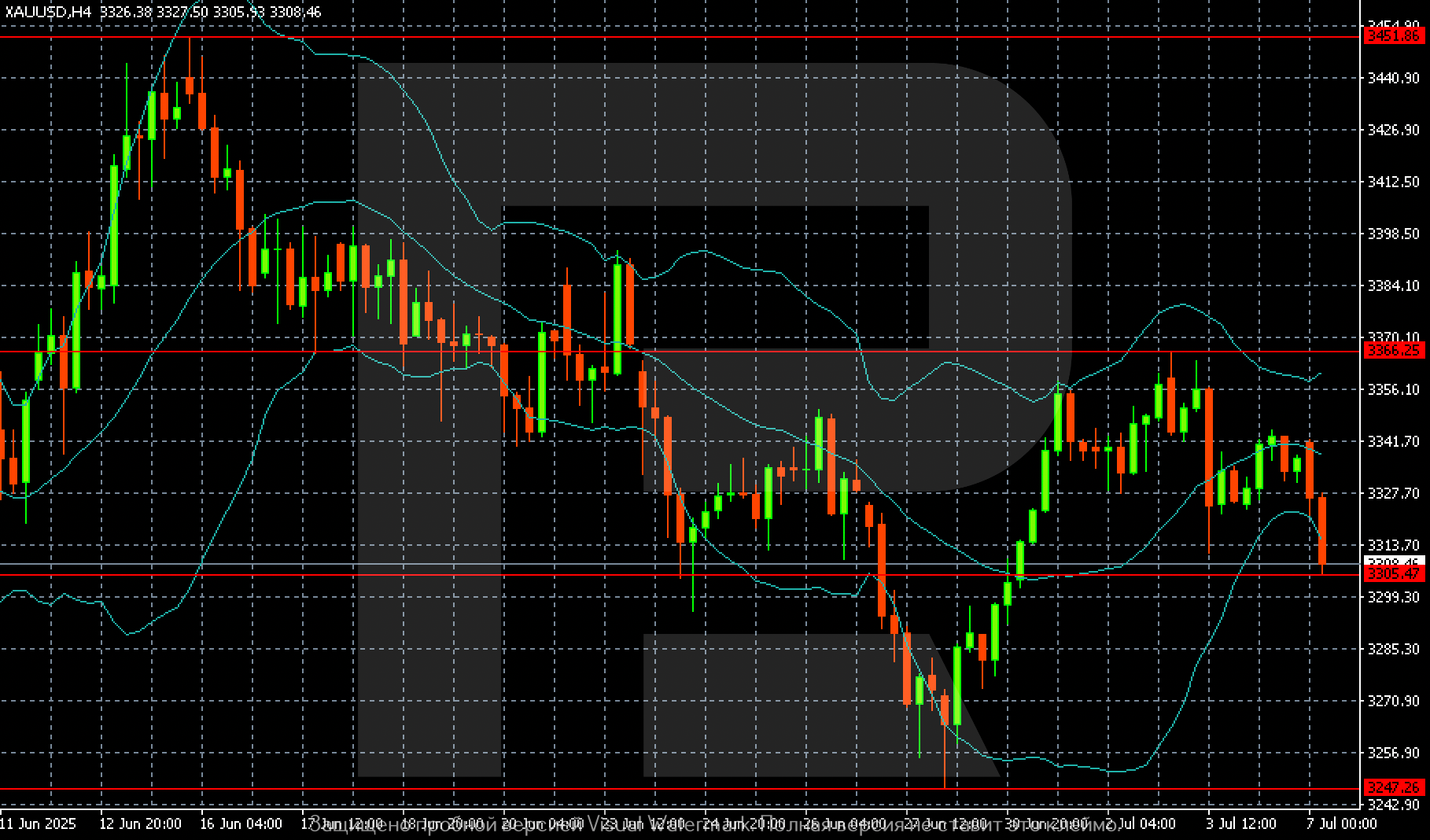 Gold (XAUUSD) price falls to 3,305 USD on Monday. The market awaits positive outcomes from trade negotiations. Details – in our analysis for 7 July 2025.