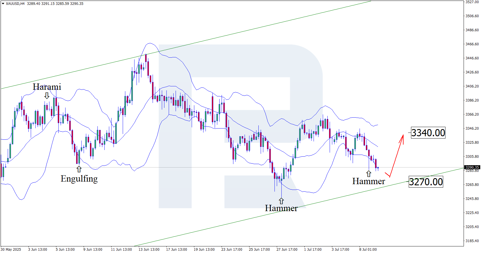 On the H4 chart for XAUUSD, price formed a reversal ‘Hammer’ pattern near the lower Bollinger Band. At this stage, it may form an upward wave in line with the pattern signal. Considering that XAUUSD quotes remain within the upward channel, further development of the upward trend can be expected. At this stage, the target resistance for growth may be 3,340 USD.