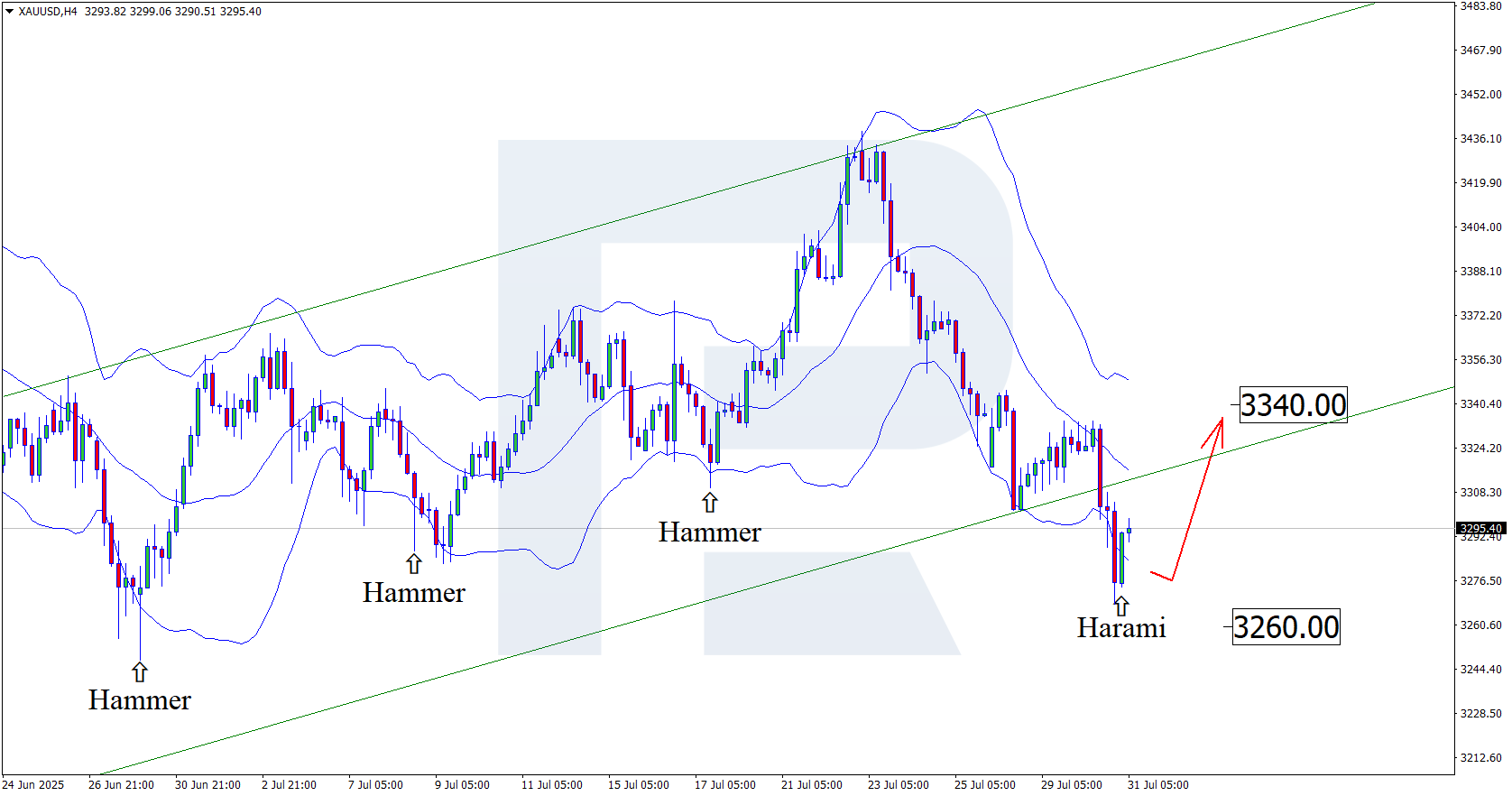 On the H4 chart, XAUUSD prices formed a Harami reversal pattern near the lower Bollinger Band. At this stage, quotes may start an upward wave following the signal from the pattern. Given that XAUUSD prices have broken out of the ascending channel, a potential return into the channel could resume the uptrend. For now, an upside target may be the 3,340 USD resistance level.