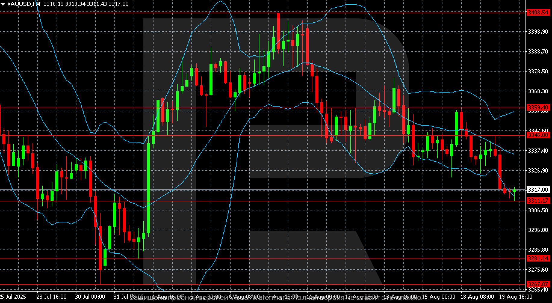 Gold (XAUUSD) prices are ready to hit three-week lows. The gold (XAUUSD) forecast for today, 20 August 2025, does not rule out intensified selling towards the target of 3,265 after breaking below 3,311.