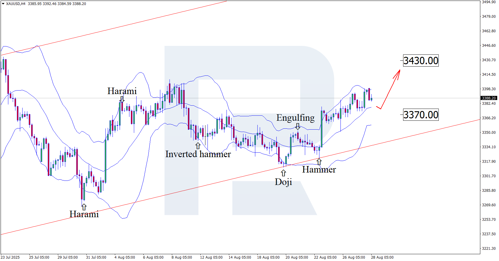 On the H4 chart, XAUUSD prices formed a Hammer reversal pattern near the lower Bollinger Band. At this stage, the pair continues an upward wave in line with the pattern’s signal. Since XAUUSD prices remain within an ascending channel, the uptrend could continue. The immediate upside target lies at 3,430 USD.