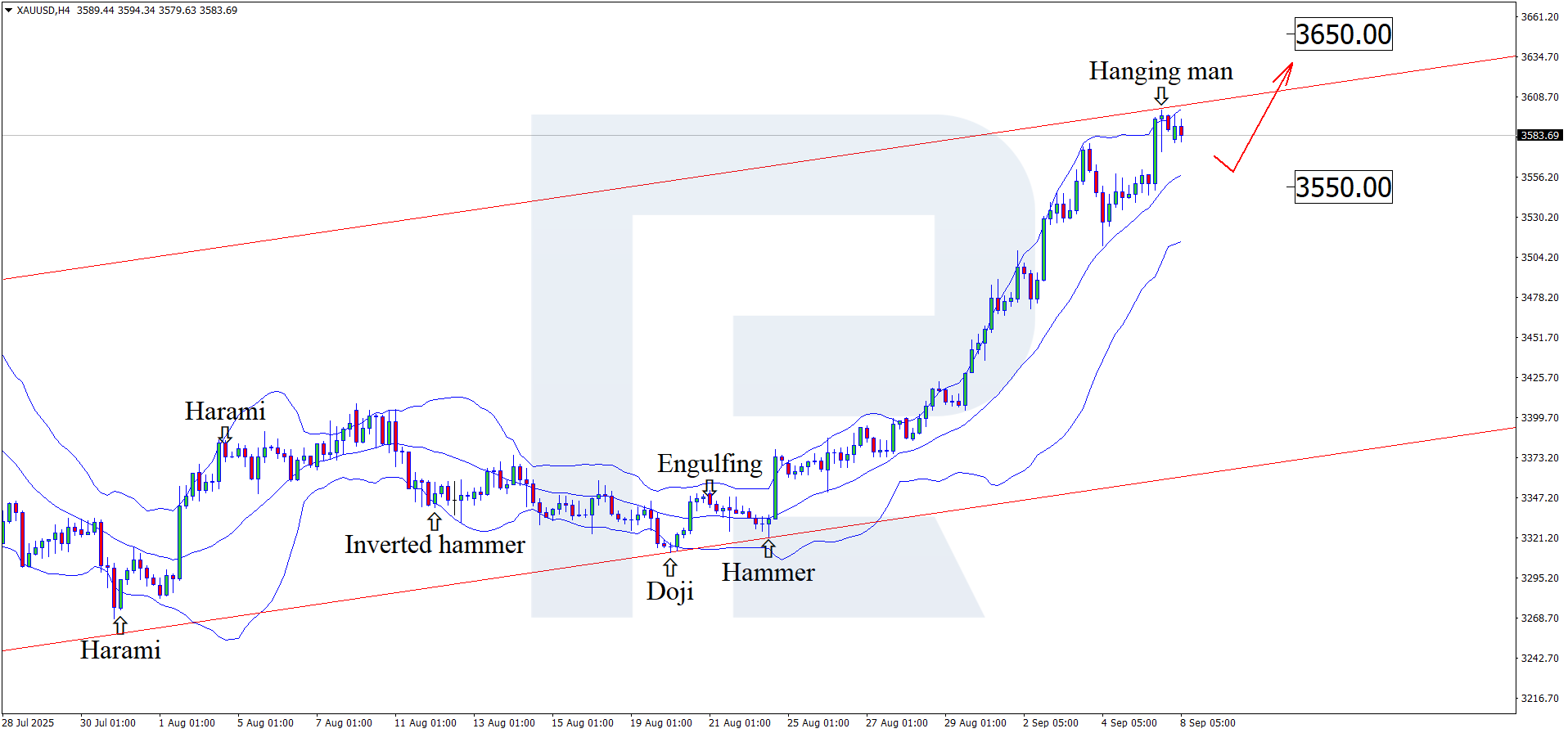 On the H4 chart, XAUUSD prices have formed a Hanging Man reversal pattern near the upper Bollinger Band. At this stage, quotes are shaping a corrective wave following the signal from the pattern. Given that XAUUSD quotes remain within an ascending channel, the broader outlook still suggests continuation of the bullish trend. The current correction target could be the 3,550 USD mark.