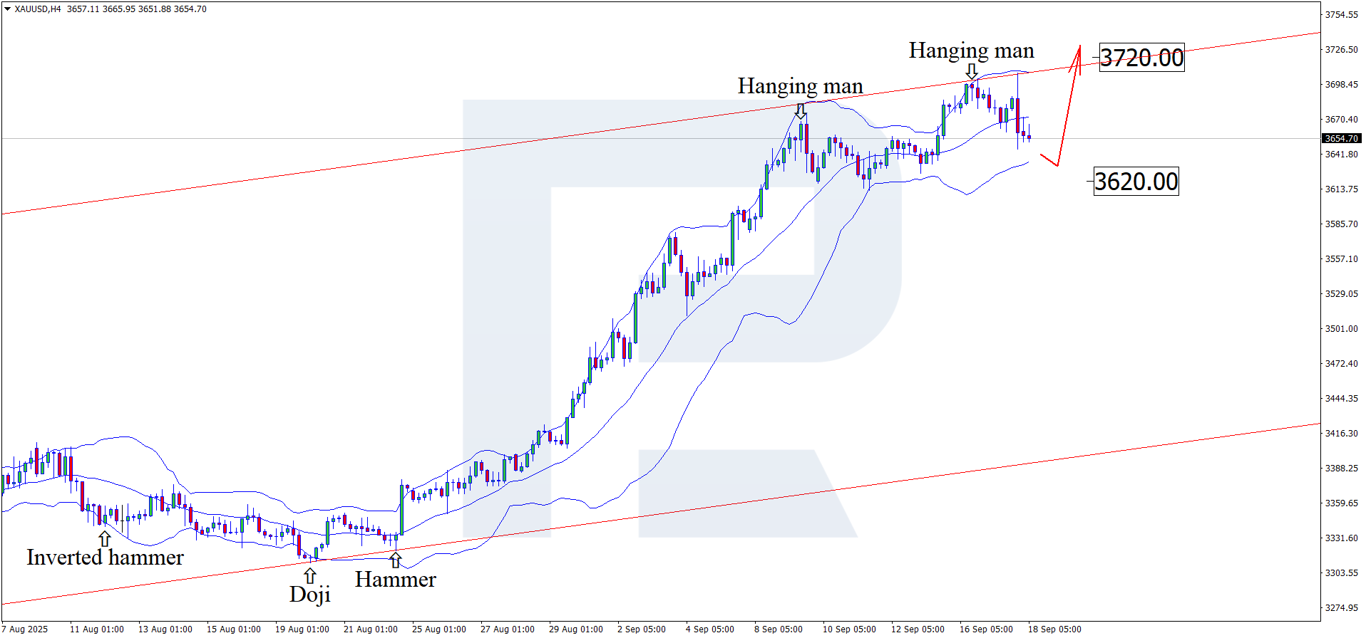 On the H4 chart, XAUUSD quotes have formed a Hanging Man reversal pattern near the upper Bollinger Band. The metal is currently in a corrective wave, following the signal from the pattern. Since prices remain within an ascending channel and given geopolitical data, they could continue their upward momentum once the correction is complete. The target for the correction could be 3,620 USD.