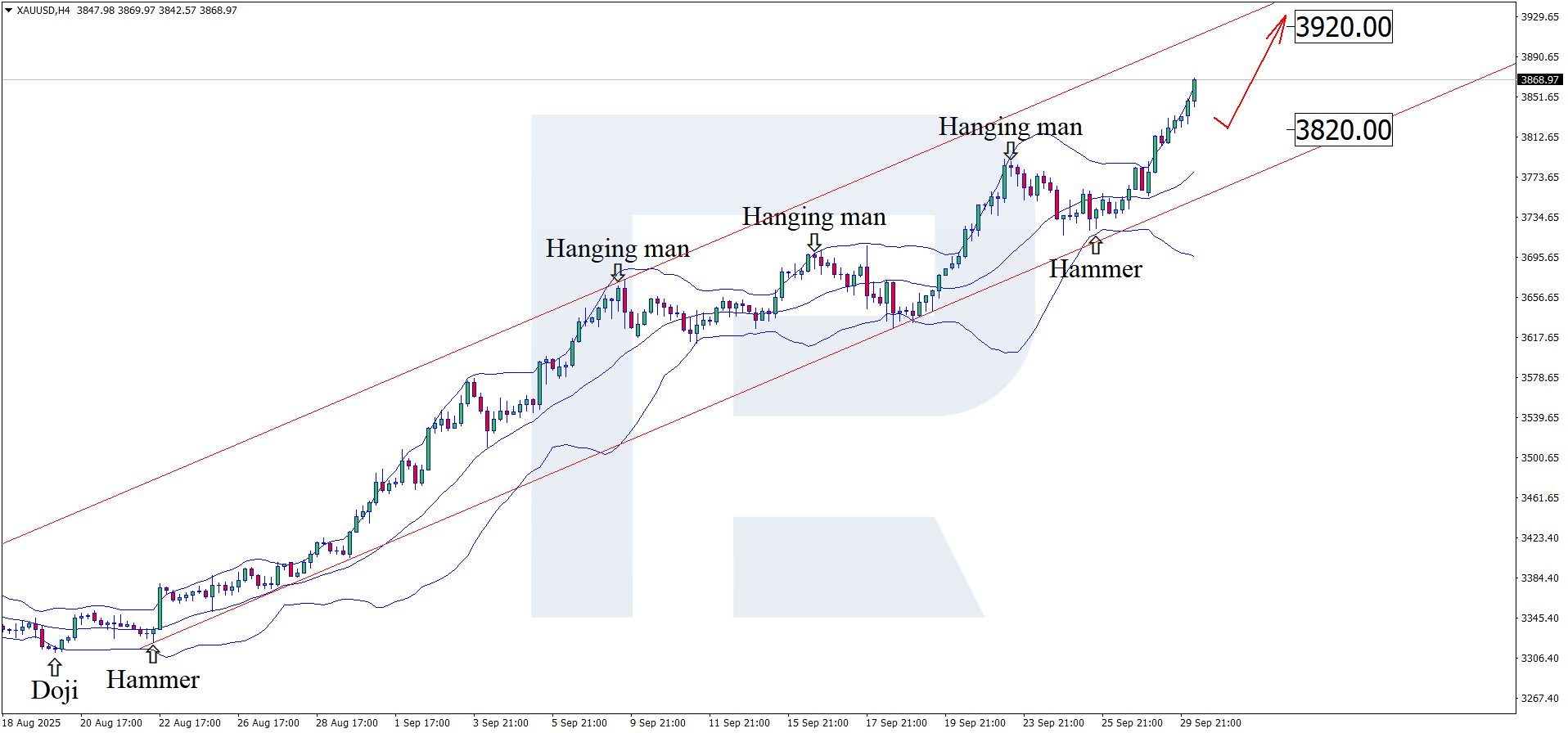 On the H4 chart, XAUUSD prices formed a Hammer reversal pattern near the lower Bollinger Band. At this stage, quotes continue their upward trajectory following the signal from the pattern. Since XAUUSD remains within an ascending channel and given economic data, the uptrend may continue after a potential pullback. Currently, the upside target is the 3,920 USD level.