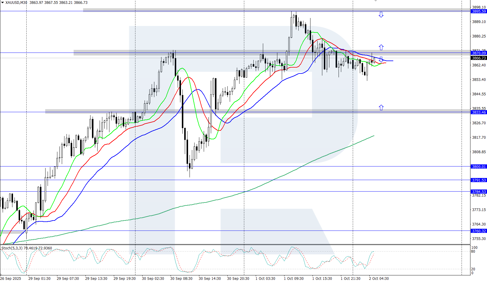 XAUUSD prices are moderately declining after a sharp rally and a new all-time high at 3,895 USD. Find more details in our analysis for 2 October 2025.