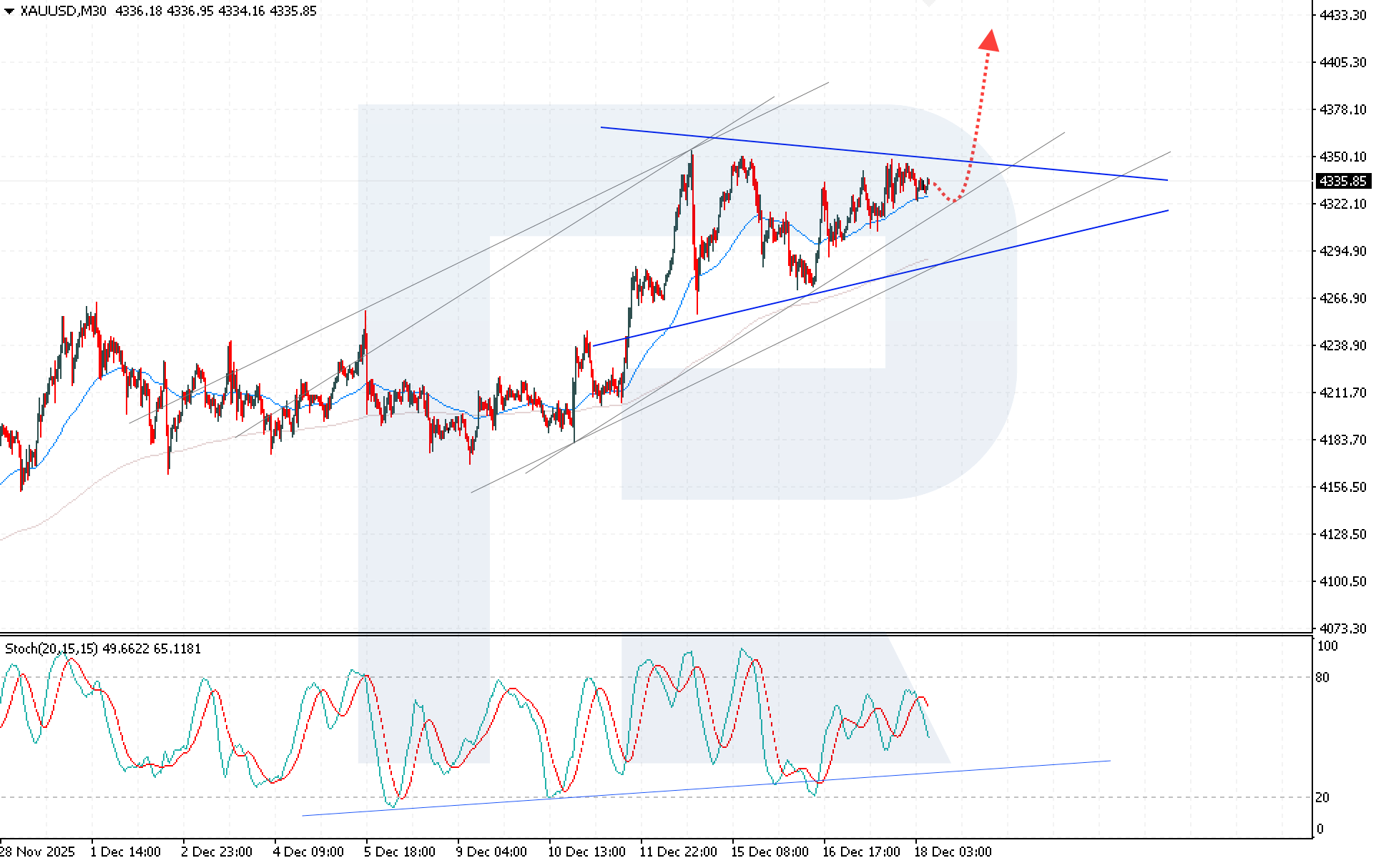 XAUUSD maintains its bullish momentum amid easing expectations regarding U.S. monetary policy. The current price stands at 4,335 USD. Details — in our analysis for 18 December 2025.