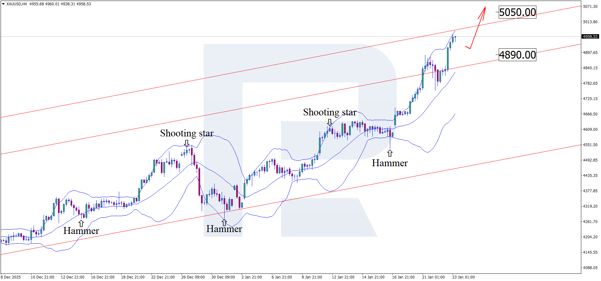 On the H4 chart, XAUUSD formed a Hammer reversal pattern near the lower Bollinger Band. At this stage, prices continue to develop an upward wave following the pattern’s signal. Since XAUUSD quotes remain within an ascending channel, the next psychological upside target may be 5,050 USD.