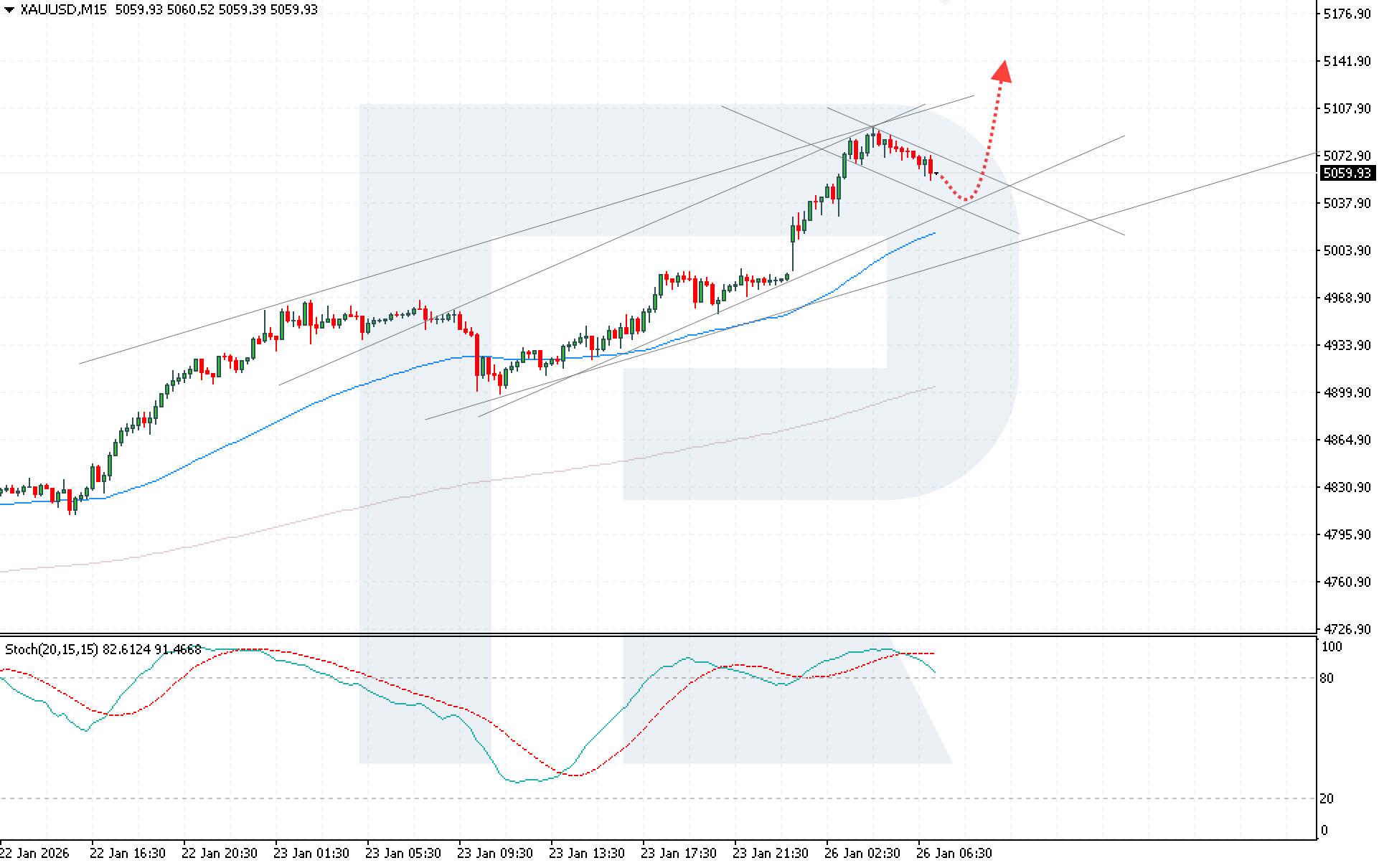 XAUUSD quotes are hitting new all-time highs as demand for safe-haven assets surges amid rising trade and geopolitical risks. Prices are currently at 5,059 USD. Find out more in our analysis for 26 January 2026.