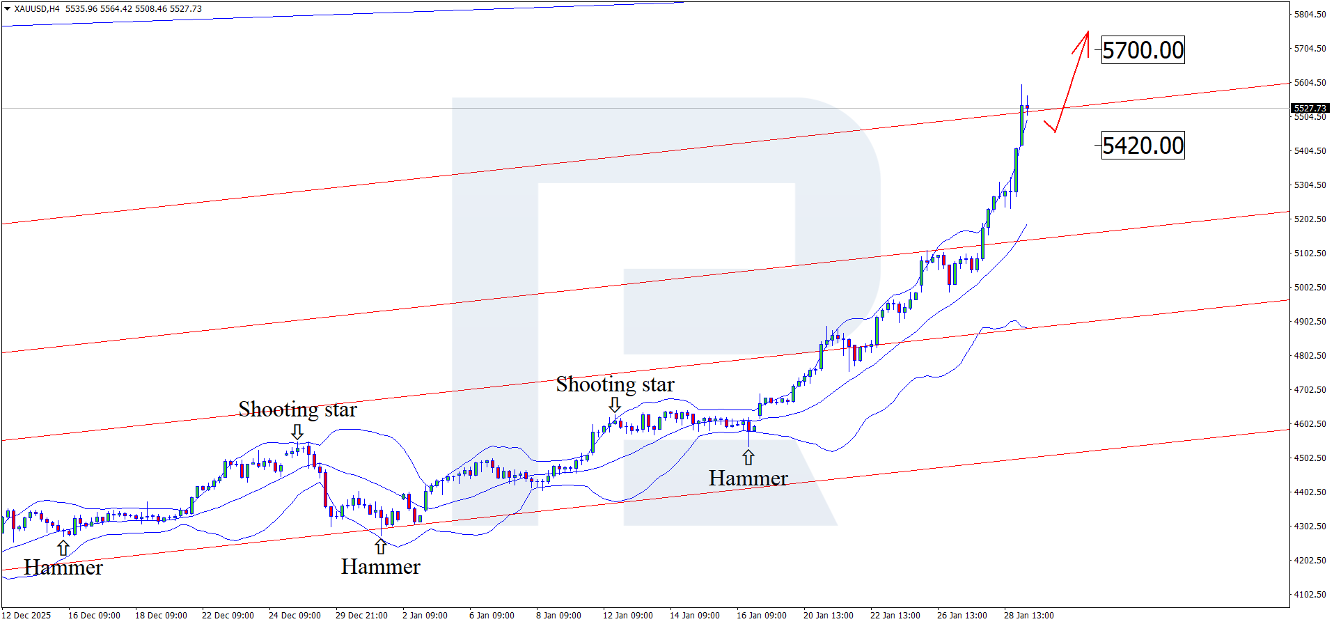 On the H4 chart, XAUUSD formed a Hammer reversal pattern near the lower Bollinger Band. At this stage, quotes continue to develop an upward wave following the pattern’s signal. Since XAUUSD prices have moved beyond the ascending channel, the next psychological upside target could be 5,700 USD.