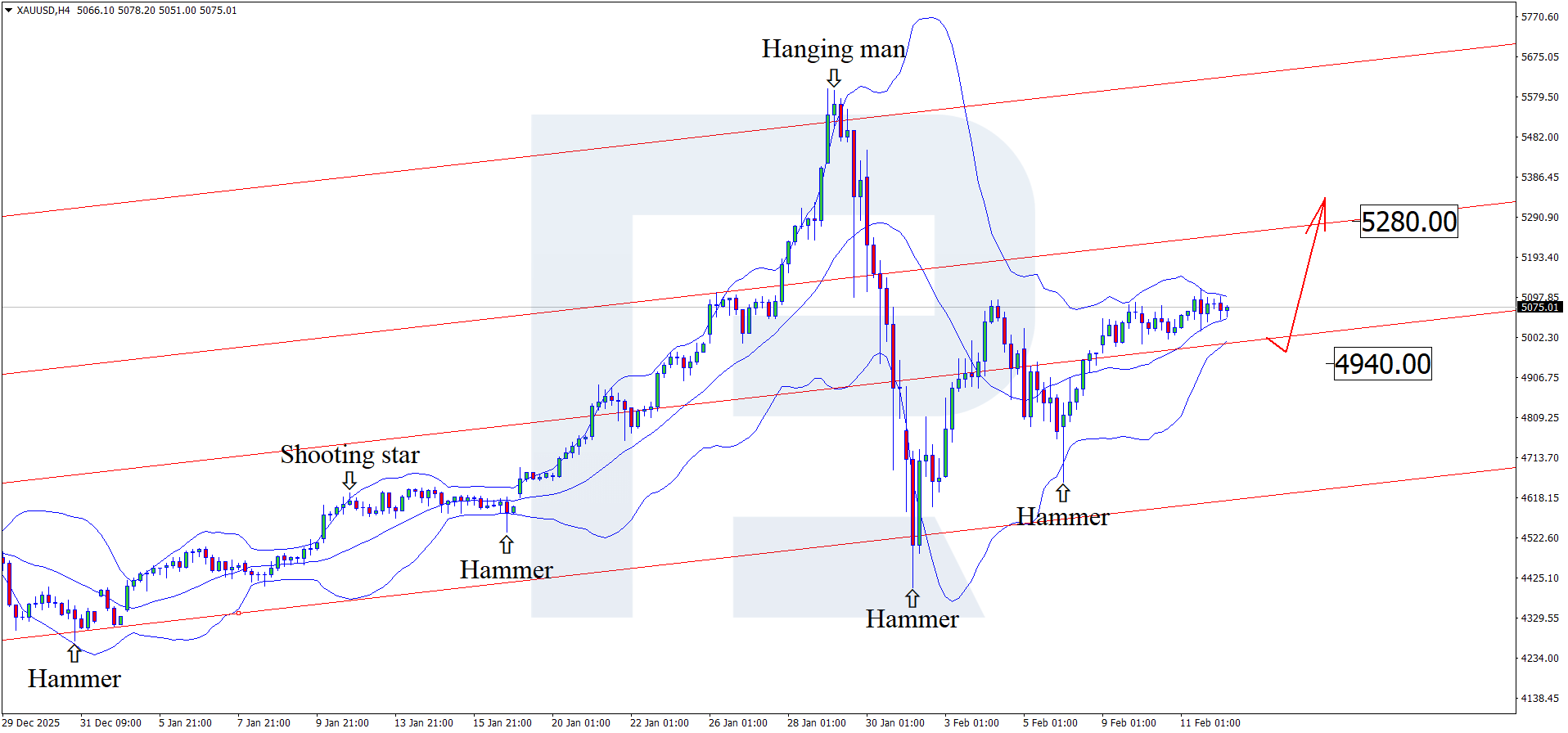 On the H4 chart, XAUUSD prices formed a Hammer reversal pattern near the lower Bollinger Band and may continue their upward momentum following the pattern’s signal. Since XAUUSD quotes remain within an ascending channel, the next upside target could be 5,280 USD.