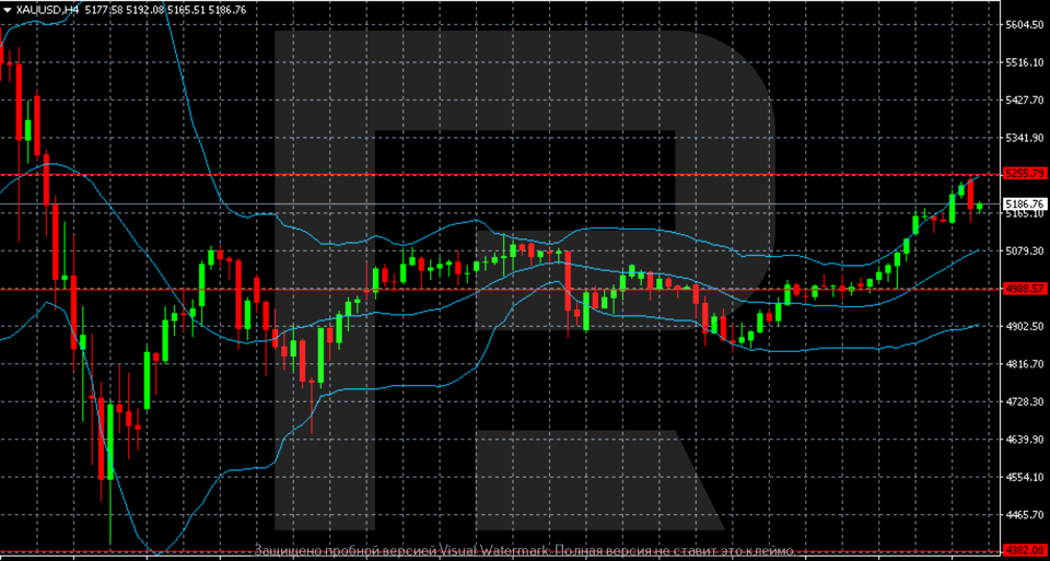 On the H4 chart, gold (XAUUSD) is recovering after declining to the 4,900–4,950 area. Prices climbed above 4,988 and continued their upward trajectory towards the 5,255 resistance level. Currently, quotes are trading around 5,185–5,190, slightly retreating from the upper boundary.