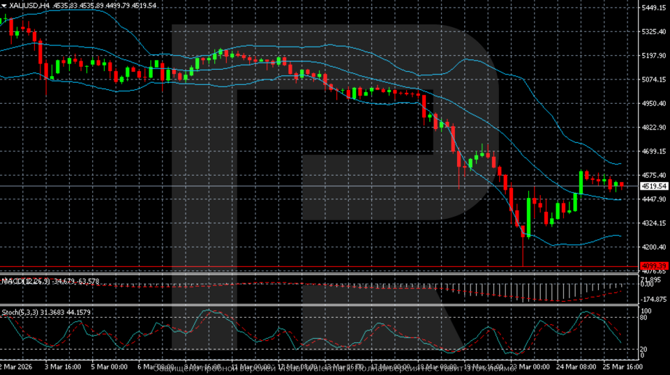 Gold (XAUUSD) fell to 4,519 USD, with the market still focused on Middle East news. Discover more in our analysis for 26 March 2026.