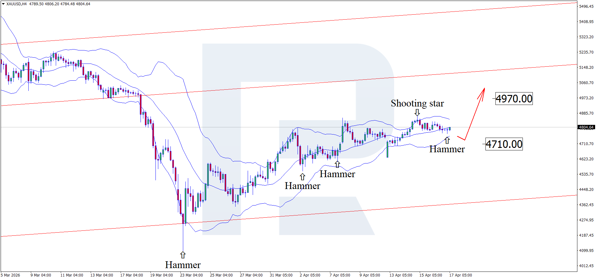 On the H4 chart, XAUUSD prices formed a Hammer reversal pattern near the middle Bollinger Band. As the pattern’s signal plays out, quotes may form an upward wave. Since XAUUSD prices remain within an ascending channel, the 4,970 USD resistance level may act as the upside target.