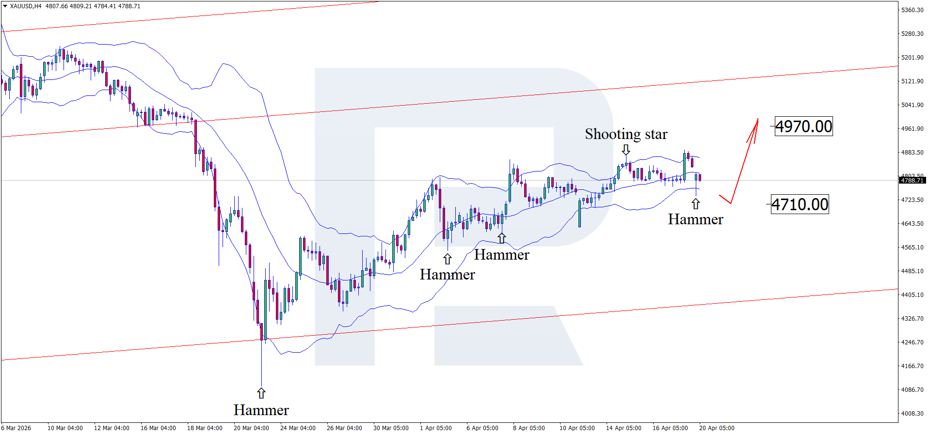 On the H4 chart, XAUUSD formed a Hammer reversal pattern near the lower Bollinger Band. Following this pattern’s signal, quotes may form an upward wave and close the gap. Since XAUUSD prices remain within an ascending channel, the 4,970 USD resistance level may act as the upside target.