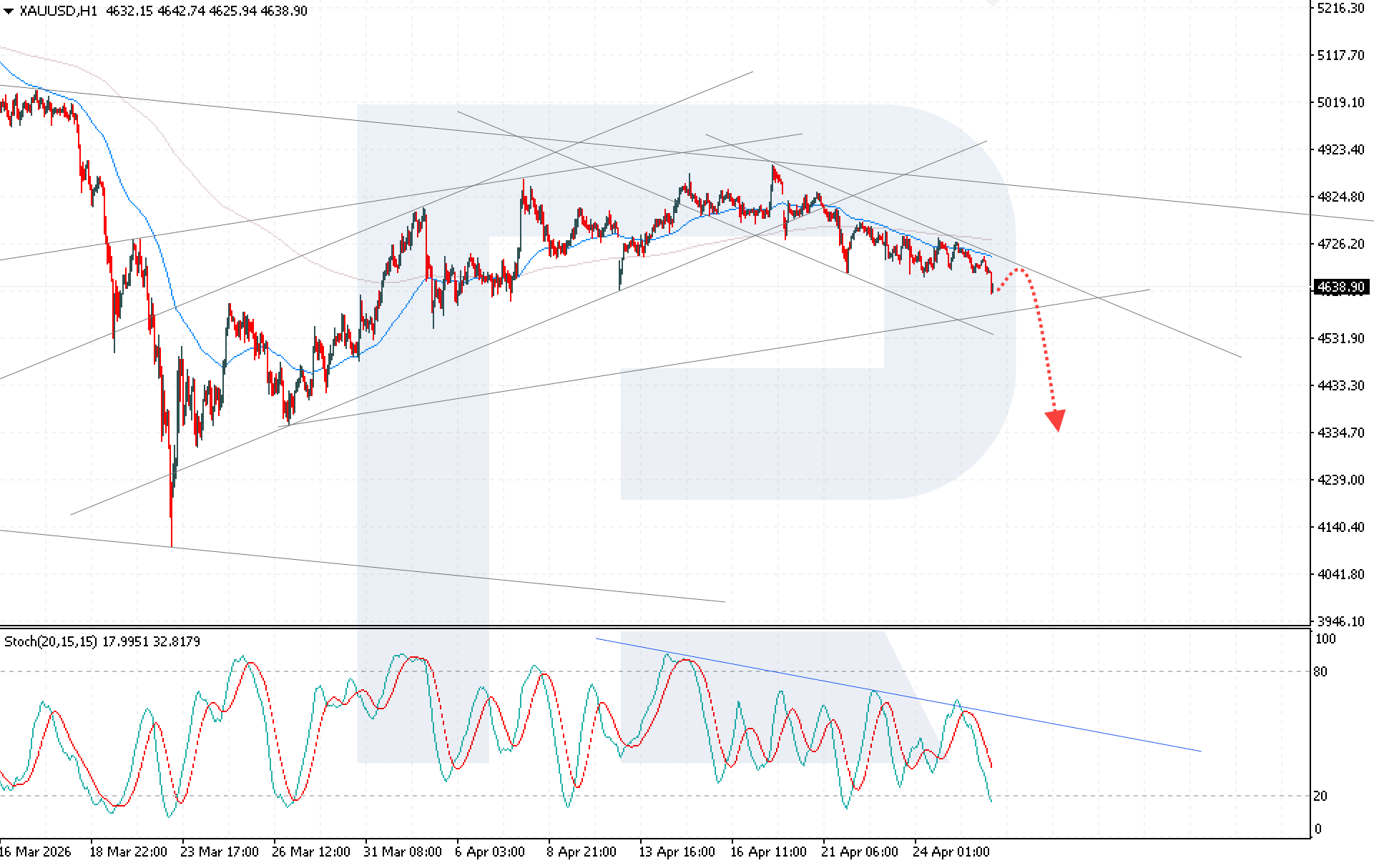 XAUUSD quotes remain under pressure amid ongoing geopolitical uncertainty, currently hovering at 4,638 USD. Discover more in our analysis for 28 April 2026.