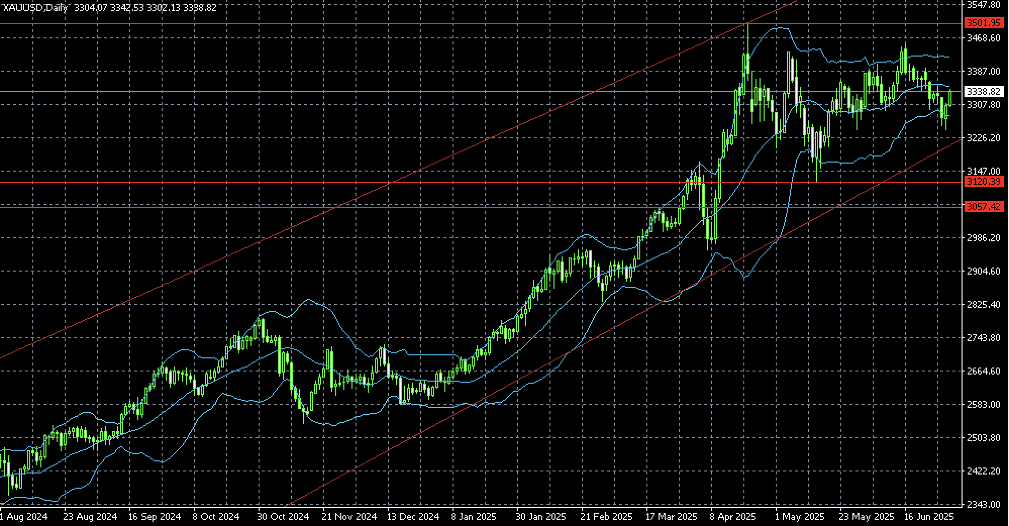 On the daily chart gold upholds the medium-term up-trend that started in late 2024. Price travels inside an ascending channel whose May peak reached 3,501.95 USD. Since then the market has corrected and now trades near 3,338 USD.