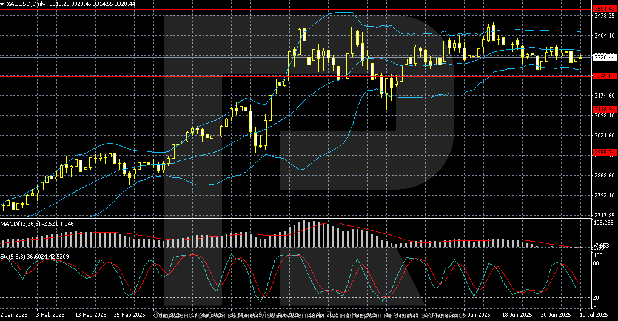 Nearest support: 3,245 USD. This is where quotes found footing in June and early July. Below lies the level at 3,118 USD, which may become the target if the range breaks down.