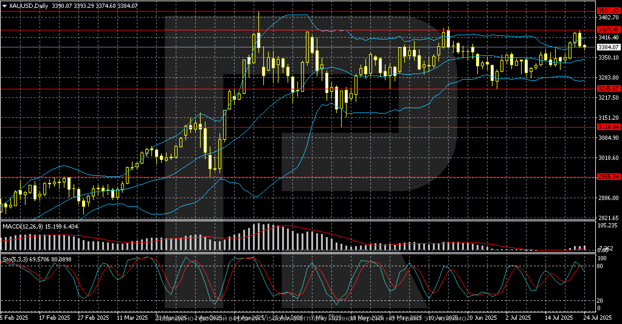 Gold (XAUUSD) ends the week in a sideways range between 3,350 and 3,435 USD per ounce. Pressure on the metal came from rising interest in risk assets due to optimism about US trade agreements with Japan and the EU. However, escalating tariff rhetoric towards India and South Korea and uncertainty in negotiations with China keep gold from a deeper correction. The weekly low is 3,351, while the high is 3,439.
