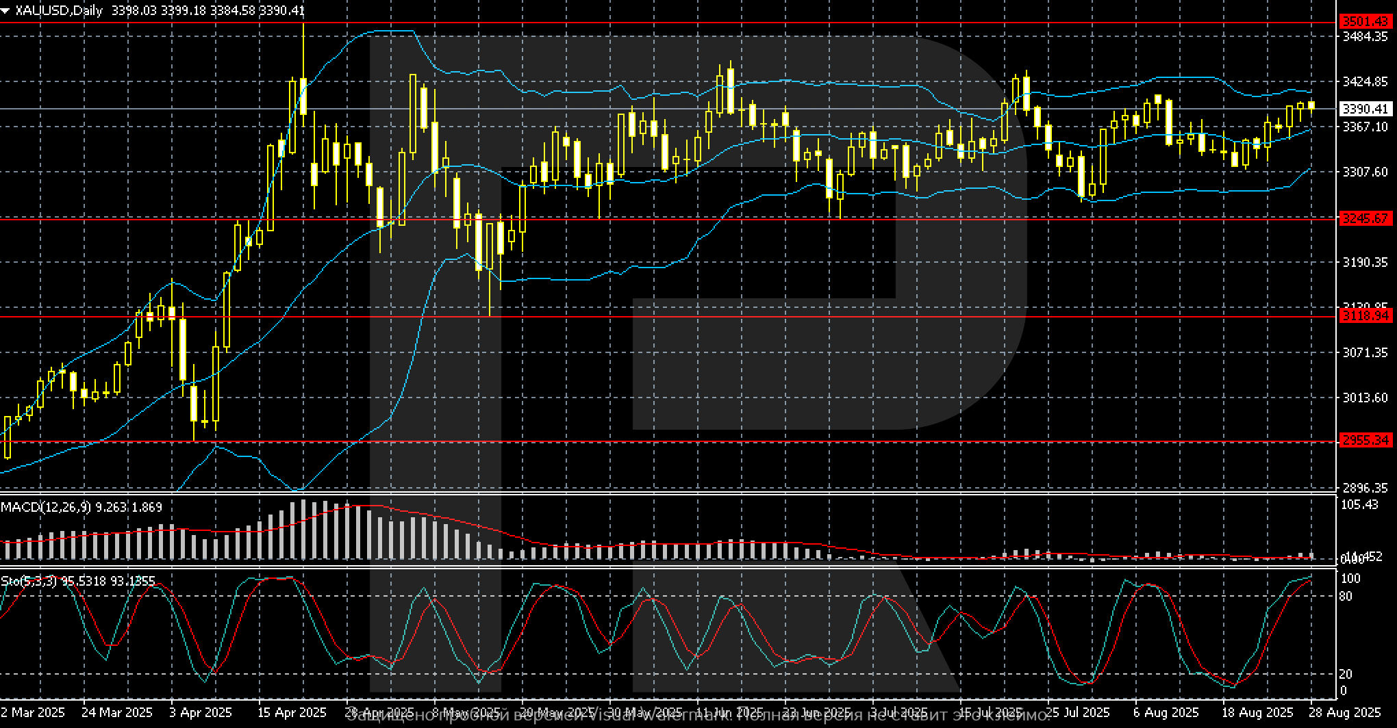The fundamental backdrop appears mixed. Gold is supported by expectations of a Federal Reserve rate cut in September, soft US inflation data, and ongoing political uncertainty. On the other hand, rising stock indices limit demand for safe-haven assets.