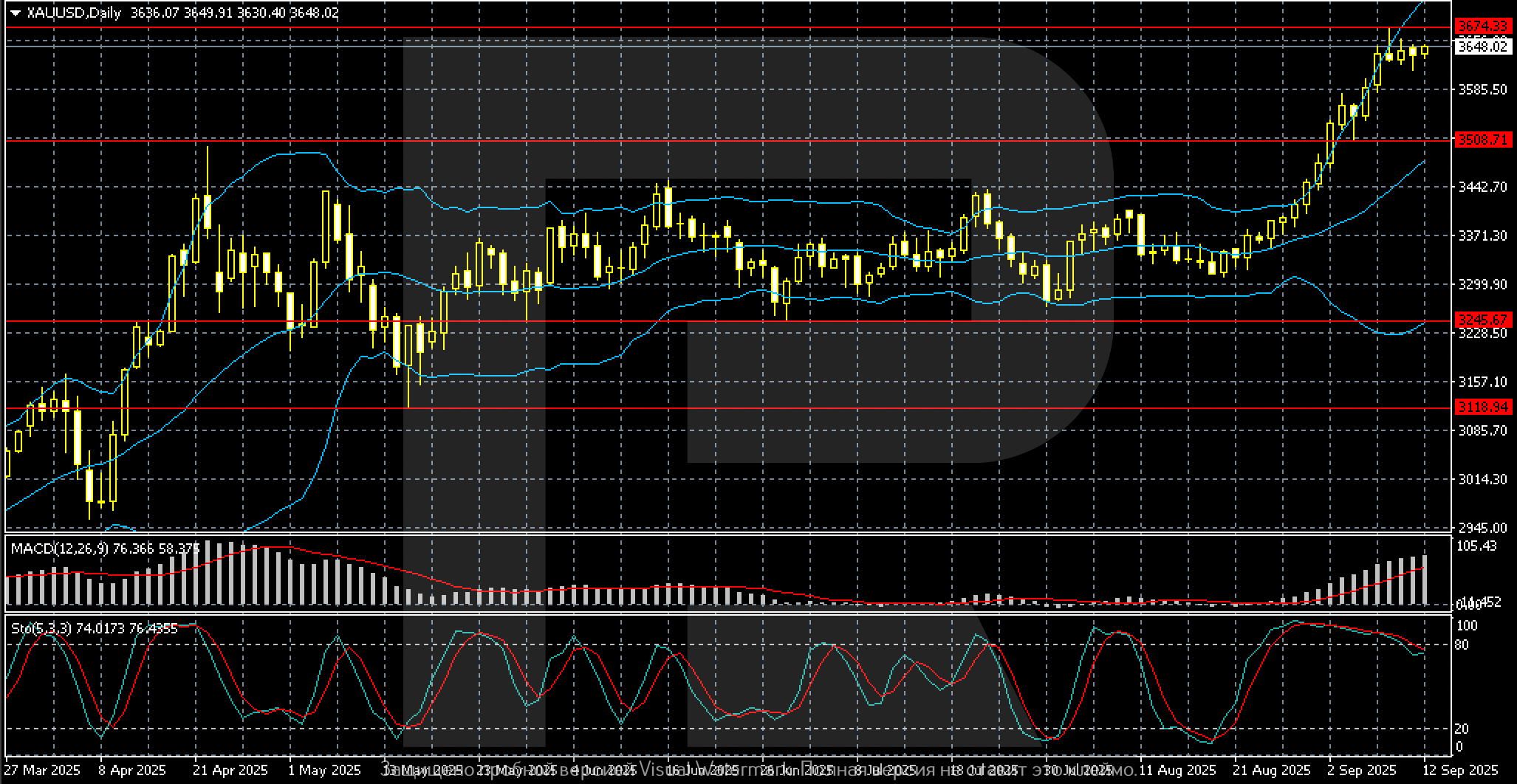 Gold (XAUUSD) is hovering around 3,648 USD per ounce, near local highs and close to historical levels. The rally is supported by expectations of a Federal Reserve rate cut at the 17 September meeting, with the market estimating a 25-basis-point dovish move as almost guaranteed. Additional demand for gold is being driven by geopolitical tensions and increased investor interest in safe-haven assets.