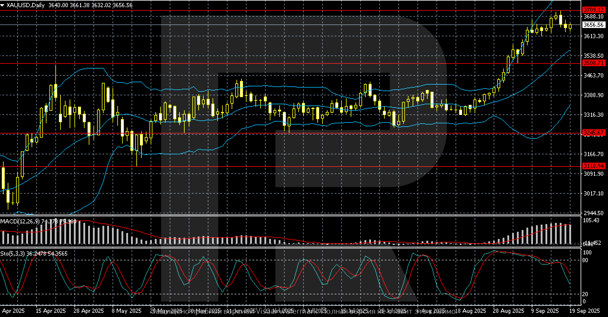 Gold remains within the 3,612–3,709 range. The baseline scenario suggests consolidation above 3,612 with the potential to reach new record highs if the Fed maintains dovish rhetoric.