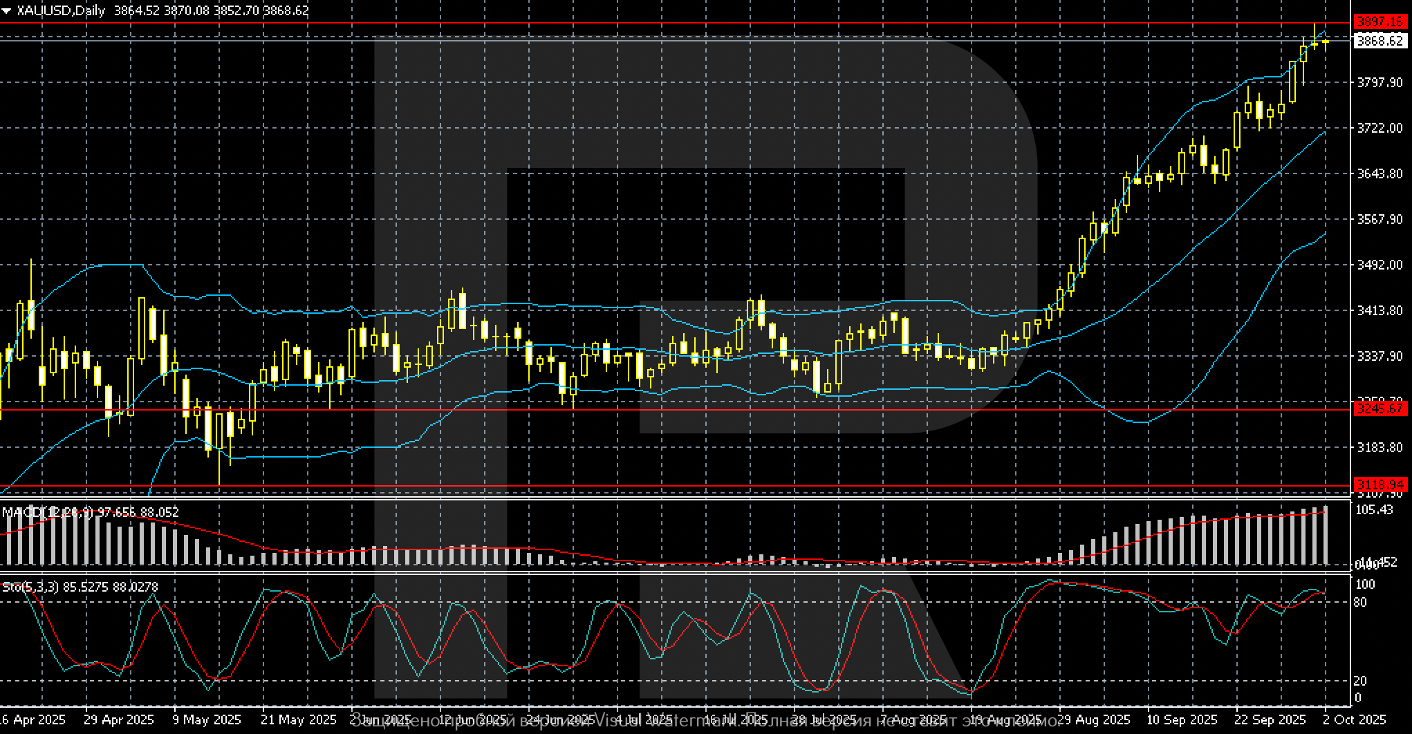The XAUUSD daily chart shows a strong uptrend that began in the second half of August 2025. Prices broke out of a multi-month sideways range above 3,600 and continue their upward trajectory towards 3,868–3,870. The key resistance level lies at 3,897, which coincides with a local high.