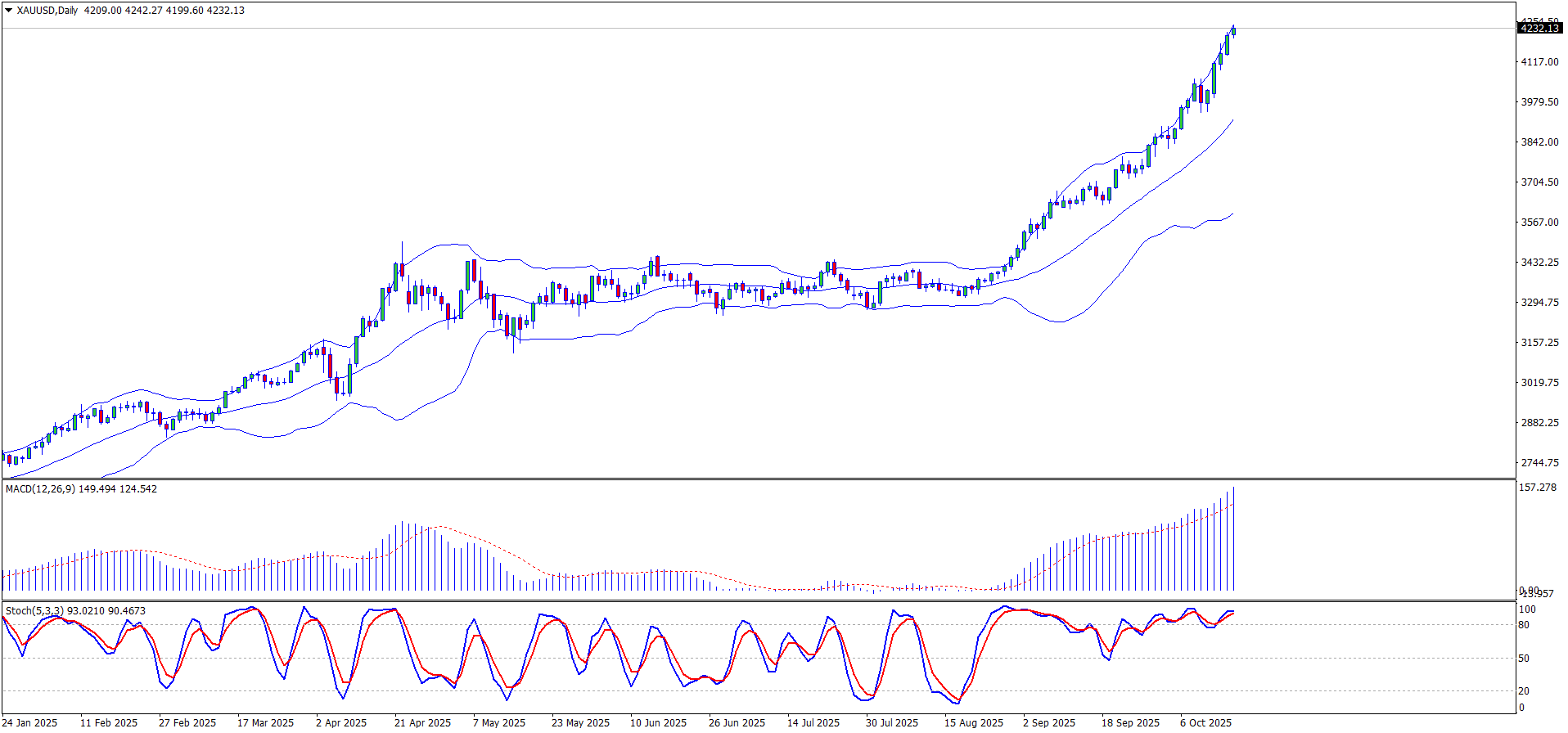 On the daily chart, XAUUSD shows strong upward momentum that began in mid-September following a long consolidation phase between 3,245 and 3,625. Since the breakout, gold has been steadily climbing and recently tested the all-time high at 4,242.