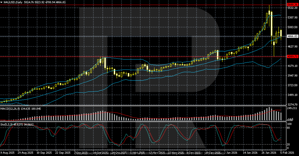 From a technical perspective, the market has moved from a sustained uptrend into a phase of high volatility and redistribution. After peaking near 5,600, prices have pulled back and are now consolidating in the 4,860–4,900 area, which acts as the nearest resistance. The baseline scenario suggests range-bound consolidation, with elevated sensitivity to Fed signals and US dollar moves.