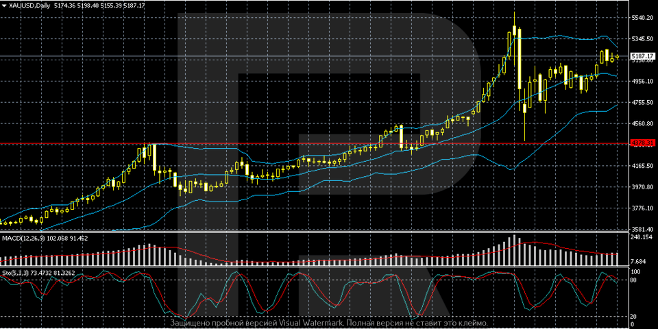 From a technical perspective, the long-term uptrend remains intact. After reaching a new all-time high near 5,400, gold entered a consolidation phase. Prices are holding above the middle Bollinger Band, and volatility is declining. MACD is in positive territory, but momentum is weakening; the Stochastic Oscillator is in the upper part of the range. The key support levels are located at 4,950–5,000 and 4,750, and the resistance level lies at 5,400.