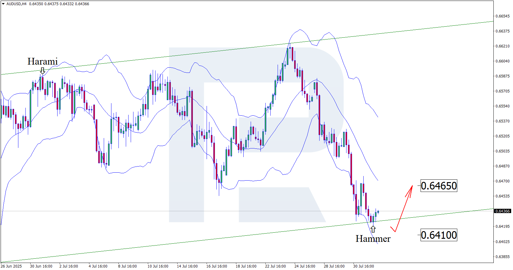 On the H4 chart, the AUDUSD pair tested the lower Bollinger Band and formed a Hammer reversal pattern. At this stage, the pair may develop a corrective wave in response to the pattern signal. The upside target could be the resistance level at 0.6465.