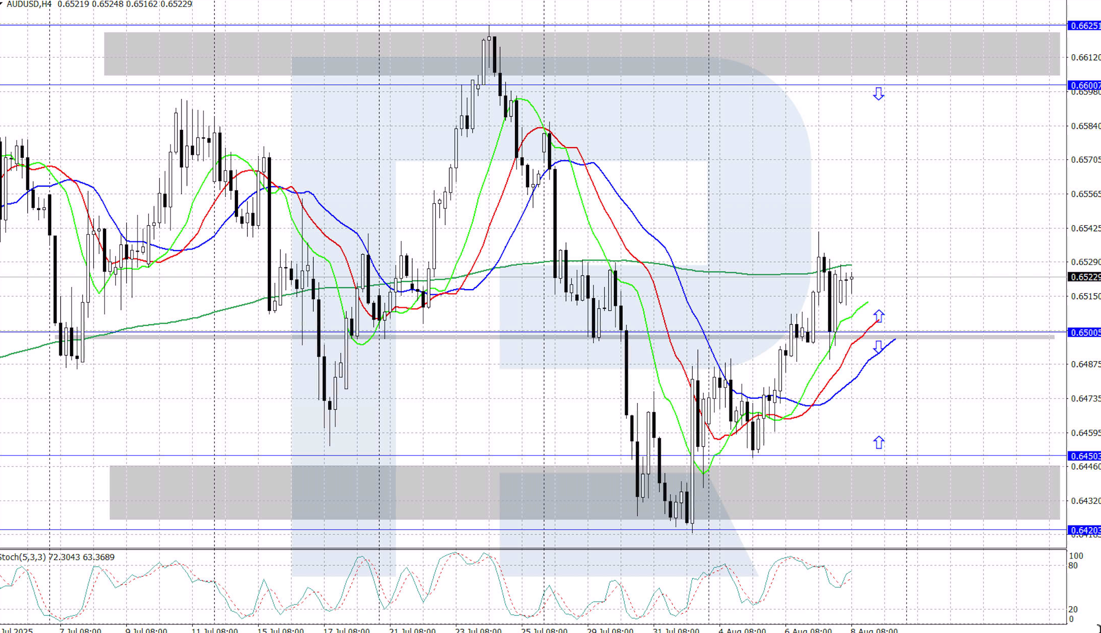 The AUDUSD rate is rising, firmly holding in the price area above 0.6500. Discover more in our analysis for 8 August 2025.