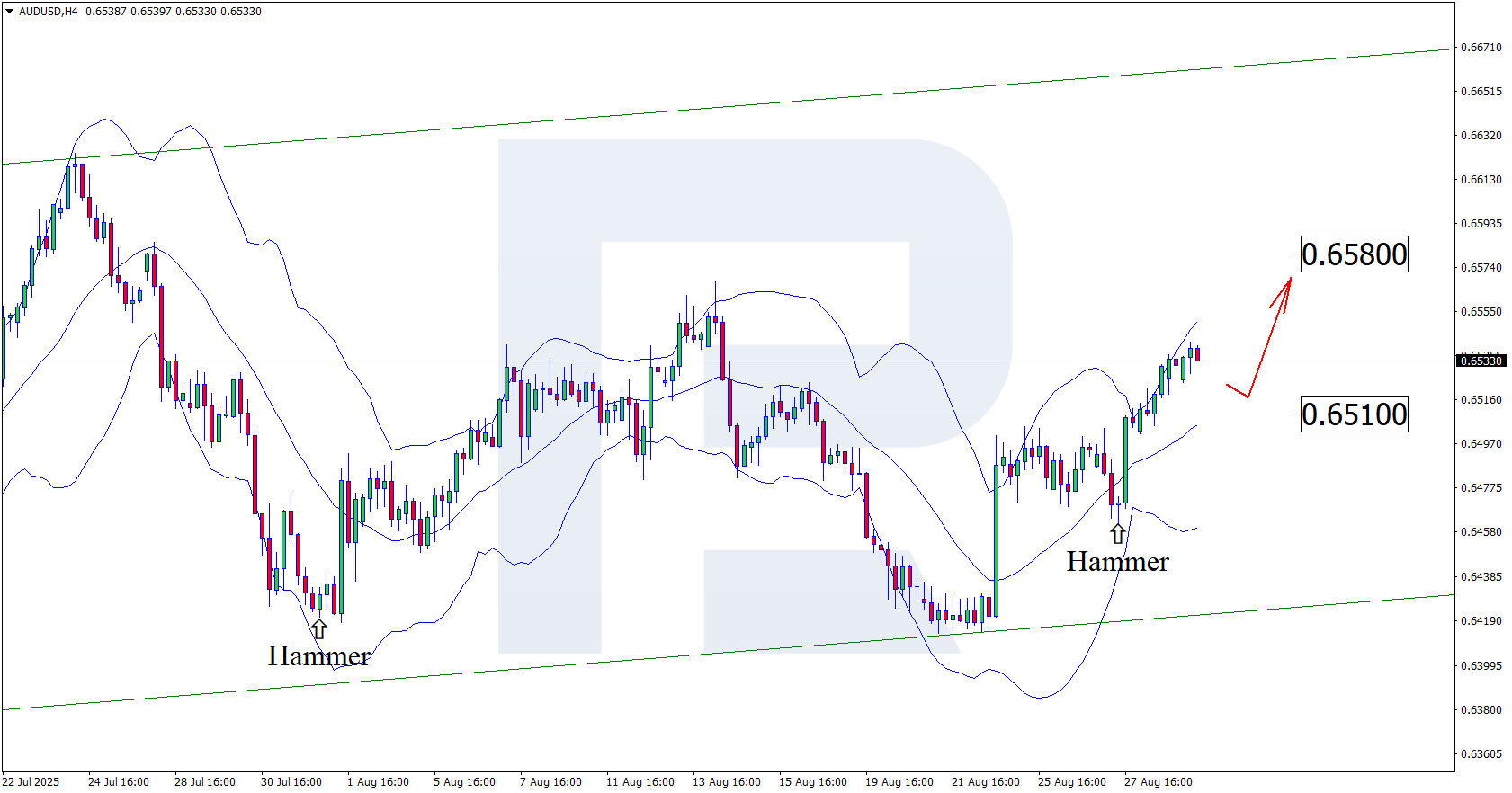 Having tested the lower Bollinger Band, the AUDUSD pair formed a Hammer reversal pattern on the H4 chart. At this stage, the pair is developing an upward wave in line with the signal, with the 0.6580 resistance level as an upside target.