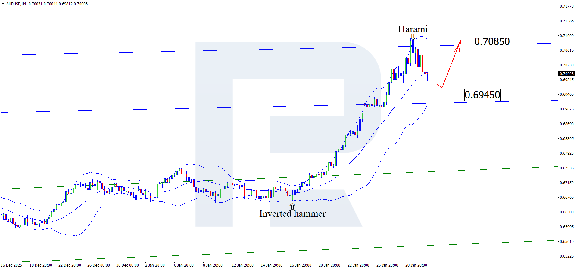 The AUDUSD forecast for 30 January 2026 also considers an alternative scenario in which prices continue the upward wave towards the nearest resistance level at 0.7085 without testing support.