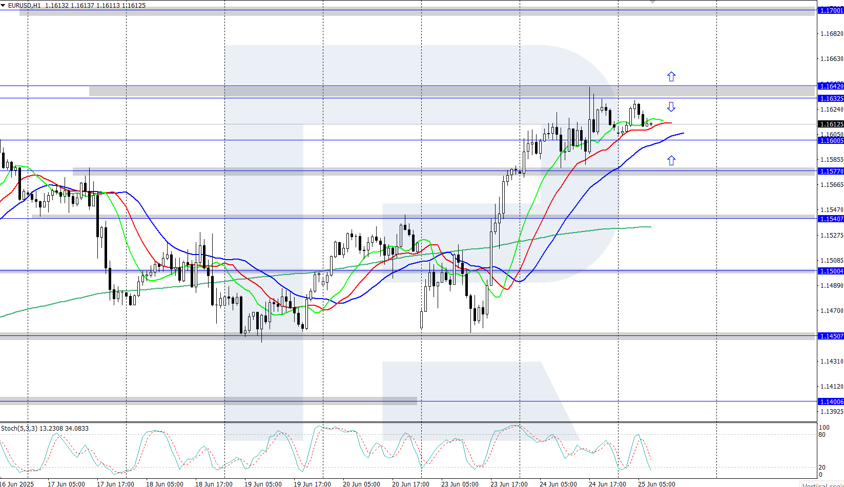 The EURUSD rate is climbing rapidly, rising above 1.1600 amid a weakening US dollar and upbeat economic data from the eurozone. Find more details in our analysis for 25 June 2025.