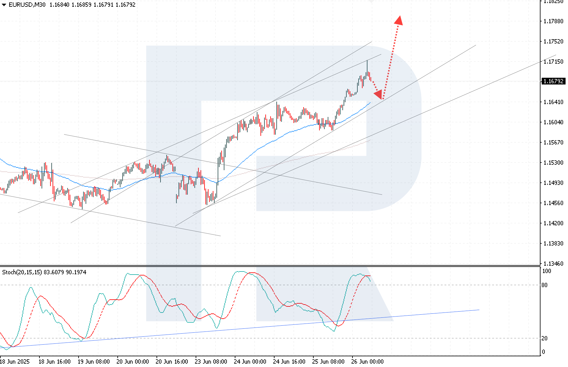 The EURUSD rate continues to rise steadily as expectations of imminent Fed policy easing grow. The price currently stands at 1.1679. Find more details in our full analysis for 26 June 2025.
