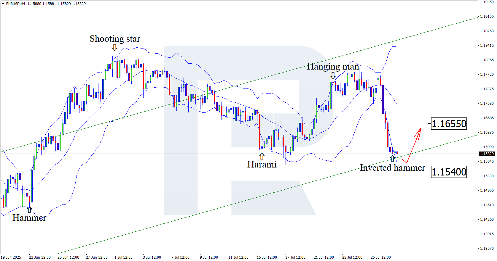 On the H4 chart, the EURUSD pair formed an Inverted Hammer reversal pattern near the lower Bollinger Band. At this stage, it may initiate an upward wave based on that signal. After the recent sharp decline, a corrective move towards the nearest resistance level at 1.1655 looks likely. A breakout above this level would open the path for further bullish momentum.