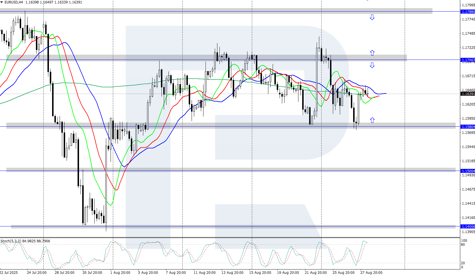 The EURUSD rate shows moderate growth, climbing above 1.1600. Today, the market focus is on US GDP statistics. Discover more in our analysis for 28 August 2025.