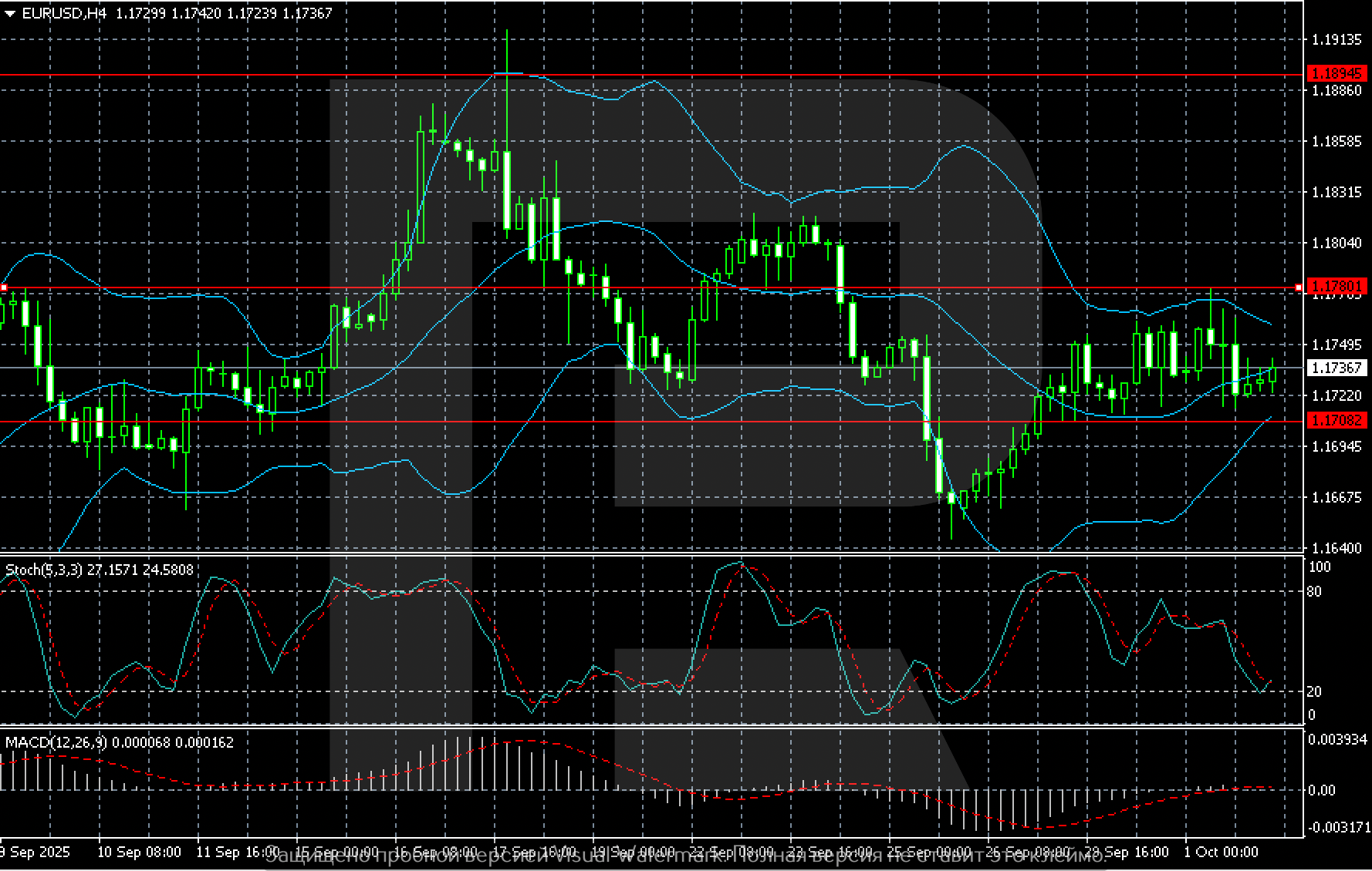 On the H4 chart, the EURUSD pair is consolidating within the 1.1708–1.1780 range after late September’s decline. The pair is hovering near 1.1735, while Bollinger Bands have contracted, indicating lower volatility.