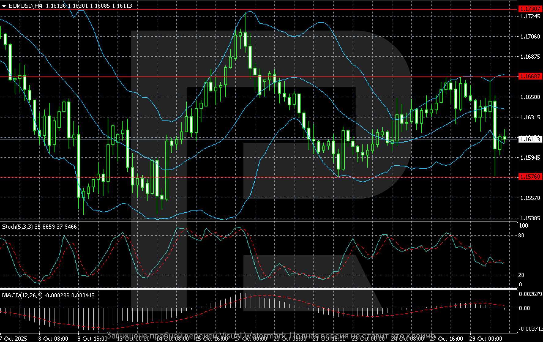 On the H4 chart, the EURUSD pair continues to trade within a sideways range, reflecting market uncertainty. After declining in early October, the pair bounced off the 1.1576 support level and repeatedly tested resistance near 1.1668, but failed to break higher. The price is now hovering around 1.1610, consolidating after recent fluctuations.