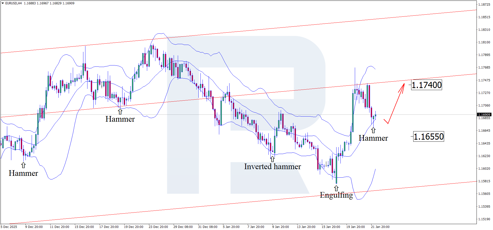 On the H4 chart, the EURUSD pair formed a Hammer reversal pattern near the middle Bollinger Band. At this stage, it may develop an upward wave as the signal plays out. Since quotes remain within the ascending channel, the pair may move towards the 1.1740 level. A breakout above this level would open the door for continued upward momentum.