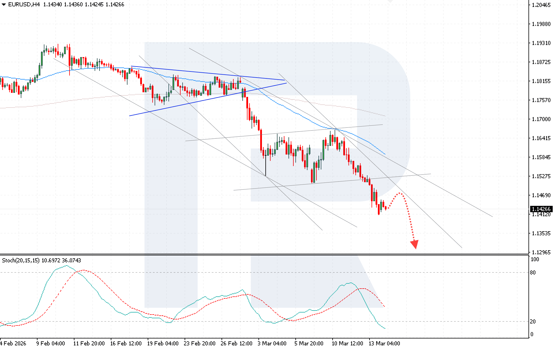 The EURUSD pair is undergoing a correction after a series of declines amid continued support for the US dollar and expectations around upcoming Fed decisions. The rate currently stands at 1.1426. Find out more in our analysis for 16 March 2026.